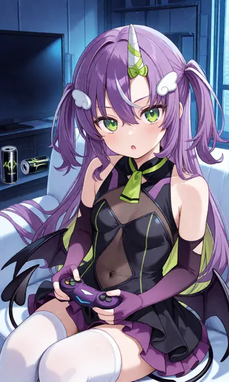amanogawa neru, neru default, single horn, wing hair ornament, long hair, two side up, demon wing, low wing, demon tail, black dress, sleeveless, covered navel, see-through, purple gloves, elbow gloves, fingerless gloves, white thighhighs, thigh strap☠️2番目の衣装:
