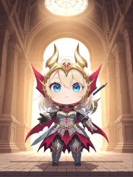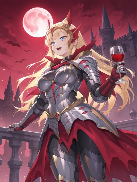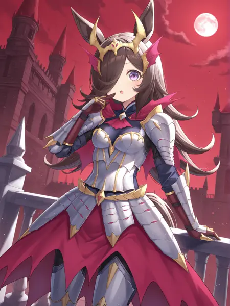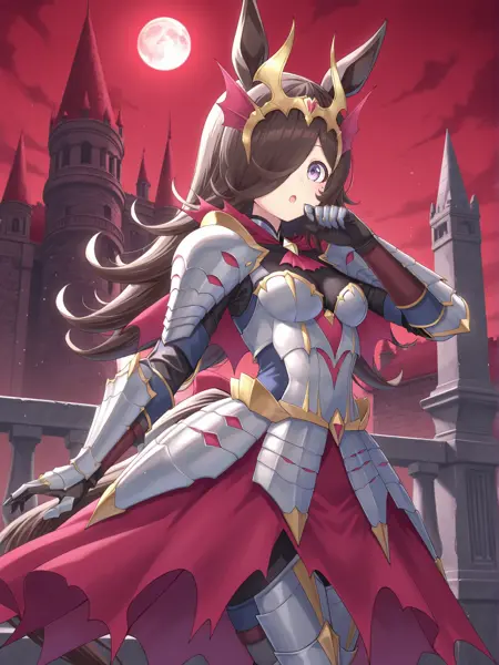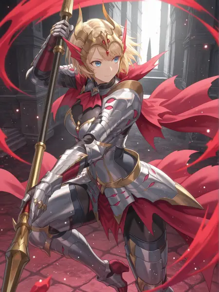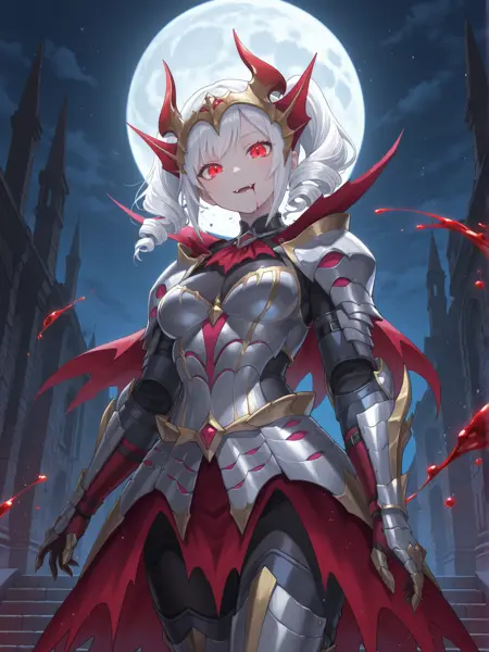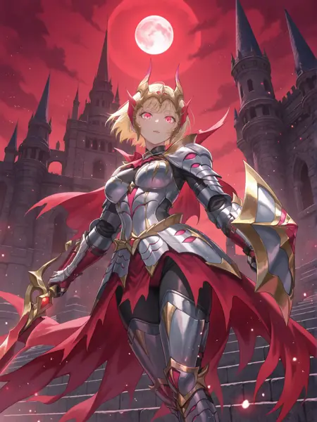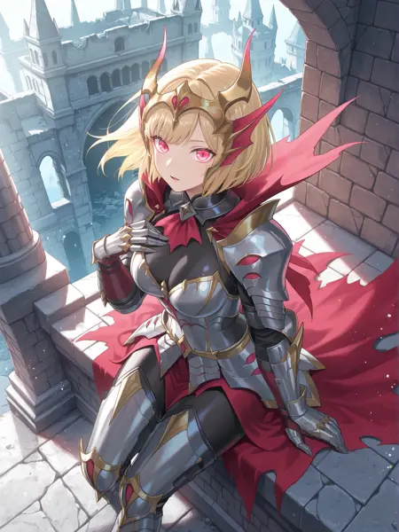 标签(服装):malzeno armor, horned headwear, red cape, red ascot, silver shoulder armor, silver breastplate, black bodysuit, silver gauntlets, silver faulds, red waist cape, silver armored boots