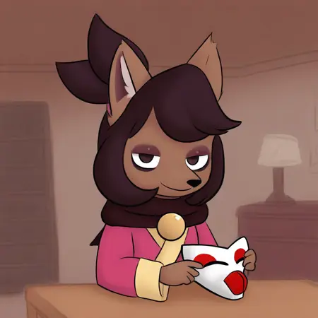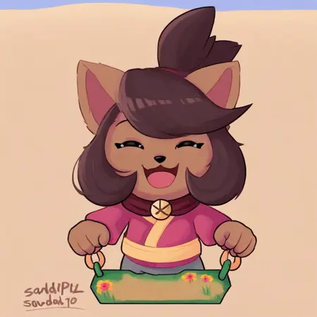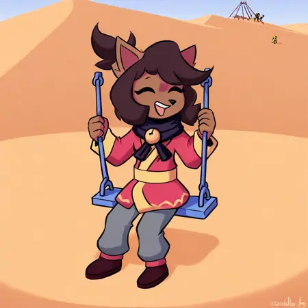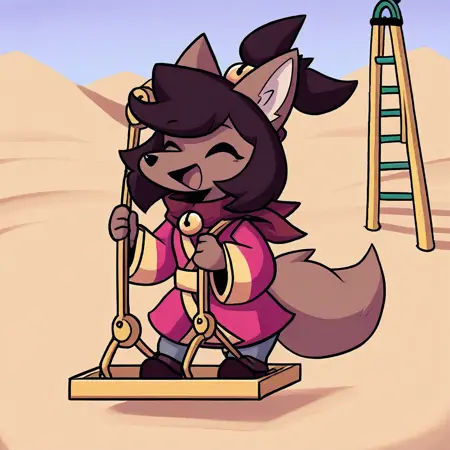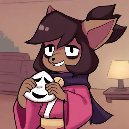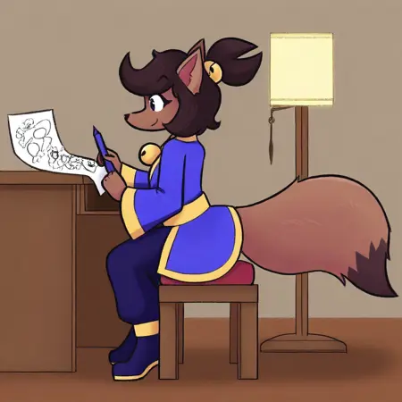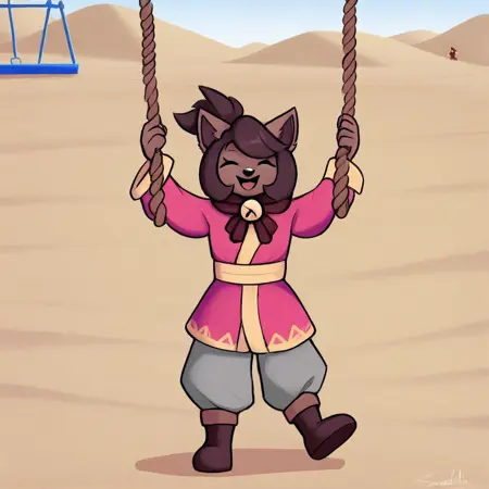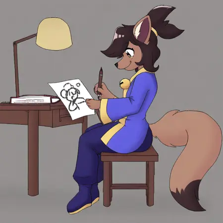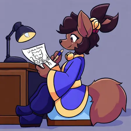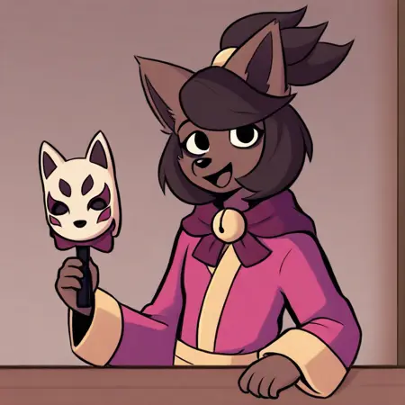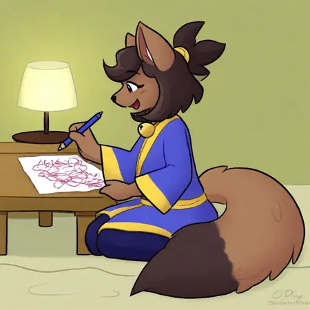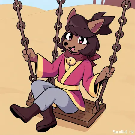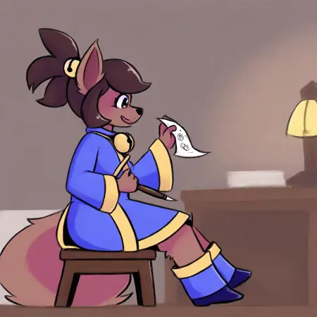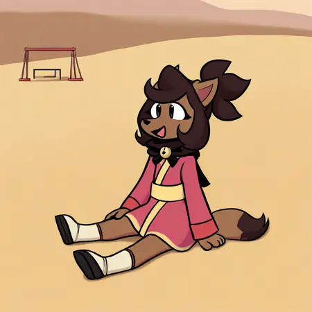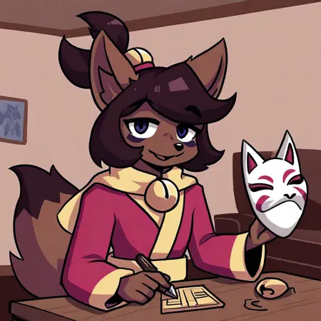 Kanako-uty, 1girl, solo, furry female, fox, brown fur, animal nose, brown hair, short hair, tied up hair, red ribbon, gold bell, dark reddish scarf, red kimono with gold trimmings, gold sash, grey pants, brown boots,