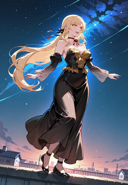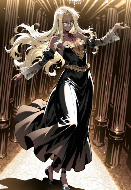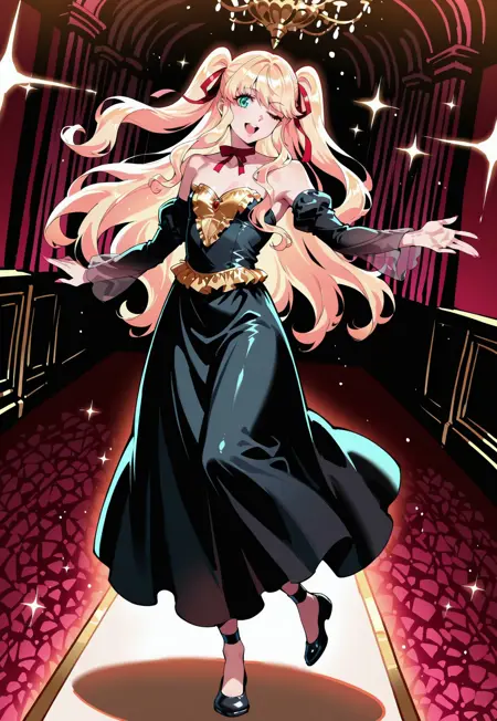 red ribbon choker, red brooch, gold frills, black long dress, strapless dress, black detached sleeves, Gradient sleeves, See-through sleeves, black ankle strap, black flats,