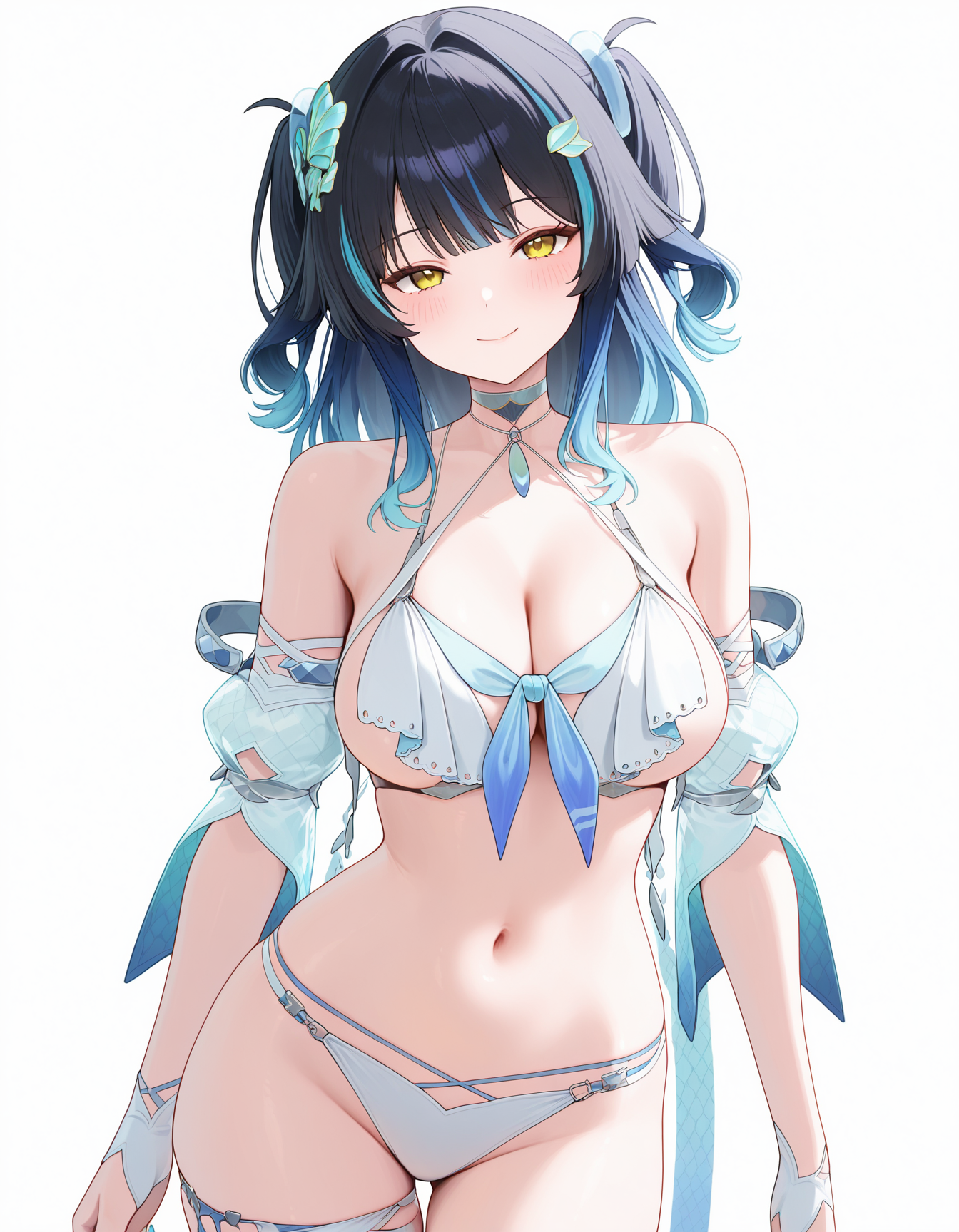 黄色眼睛,黑色头发,蓝色渐变发色,蓝色发缕,扫刘海,发丝内收,长侧发,双侧卷起,低扎长发,蓝色透明内胎发饰,蓝色透明发圈,水波发饰