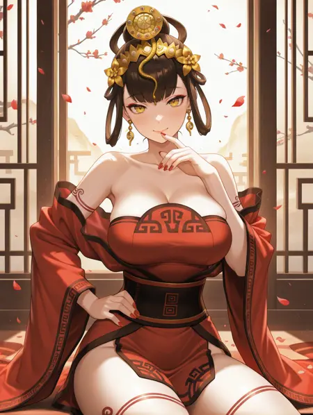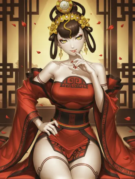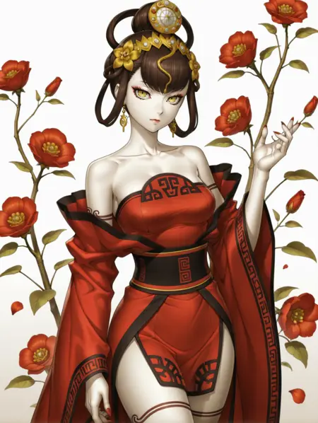 标签(服装):1个女孩,金色头饰,金色耳环,红色无肩带连衣裙,红色分离袖子,黑色腰带