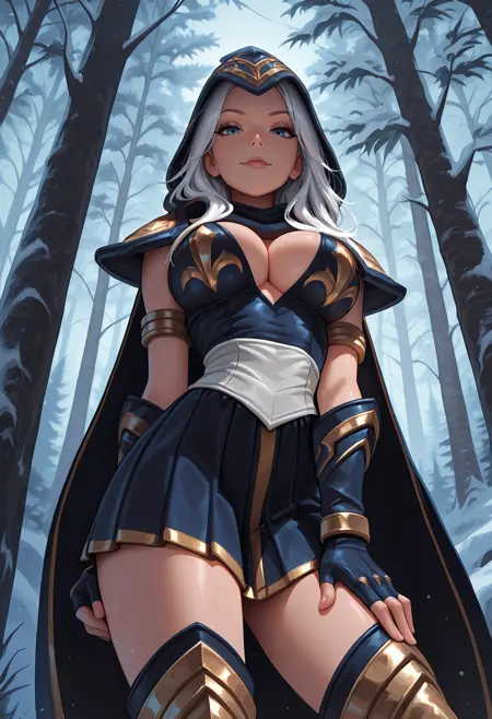 asheil, large breasts, long hair, blue eyes, gloves, dress, armor, thighhighs, white hair, pleated skirt, boots, partially fingerless gloves, shoulder armor, hood, cape, armlet,