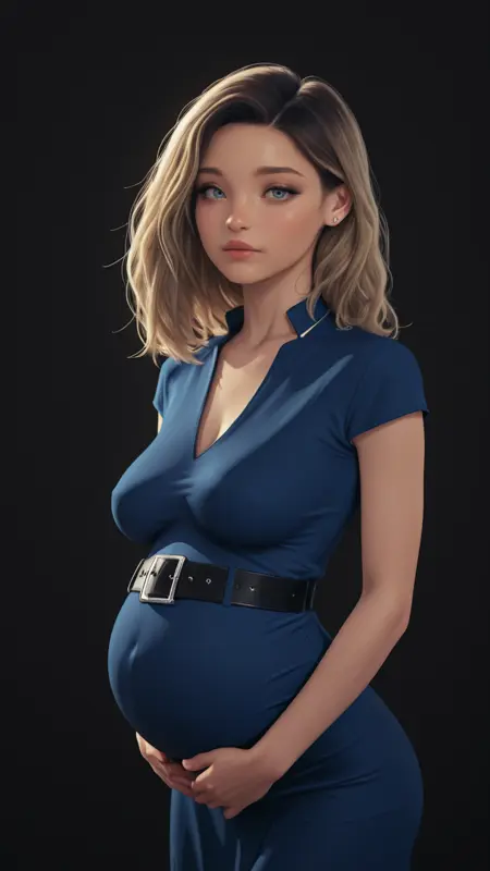 leia_shs_preggo、青い目、金髪のハイライト、濃い髪の根元、 средняя 髪、ウェーブ状に流れた髪、唇、ツヤのある唇、メイク、アイライン、中程度の胸、スタッドイヤリング、大きな妊娠したお腹、青いドレス、ぴったりしたドレス、とても短い袖、ドレスの高めのカラー、Vネック、大きな黒いベルト、大きなシルバーのベルトバックル、膝丈のドレス