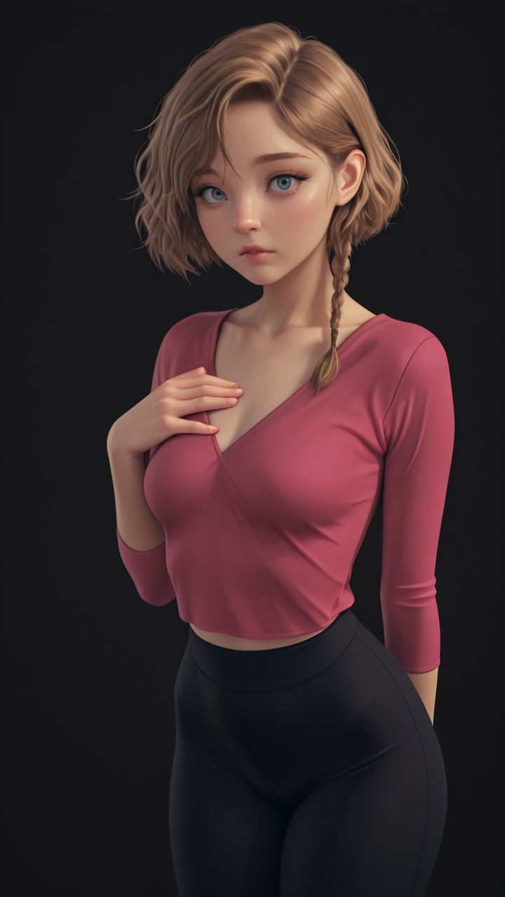 leia_shs_flashback、青い目、薄い茶色の髪、短い髪、サイドスイープの前髪、波打つ前髪、編み込み、片側編み込み、唇、ツヤのある唇、アイライナー、小胸、マゼンタのブラウス、肘までの袖、フィットした袖、Vネック、ブラックレギンス、継ぎ目のないレギンス