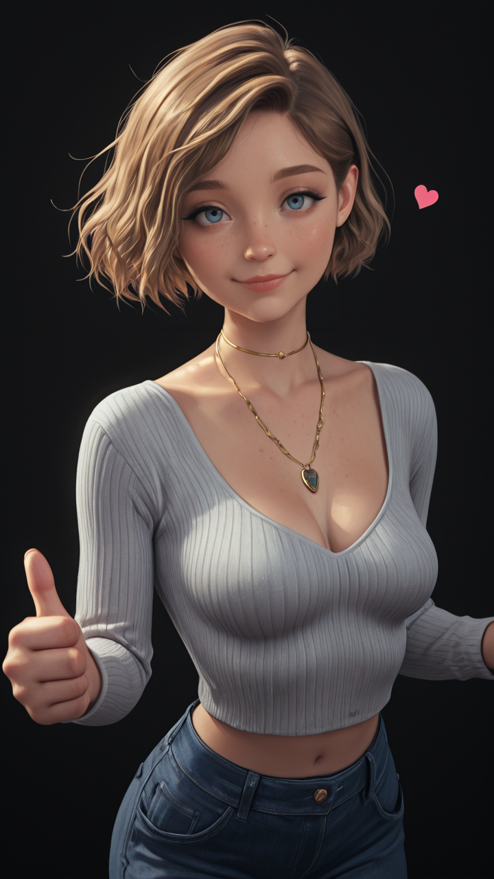 ダブルチェーンネックレス、ゴールドチェーン、チョーカーチェーン、薄いグレーのブラウス、低めのネックライン、胸元、軽い胸のほくろ、リブ加工の質感のあるブラウス、長袖、お腹の部分、青色のジーンズ