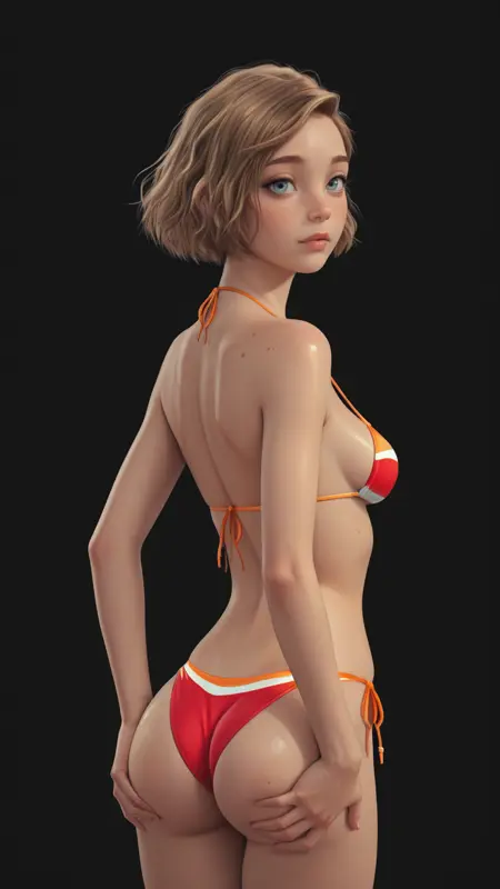 トリカラーのビキニトップ、レッドのビキニトップ、白いストライプのビキニトップ、オレンジの先端のビキニトップ、白いビキニトップの紐、スパゲッティ紐、胸元、軽い胸のほくろ、トリカラーのビキニボトム、レッドのビキニボトム、白いストライプのビキニボトム、オレンジのトリムのビキニボトム、サイドタイのビキニボトム、オレンジの紐でサイドタイ