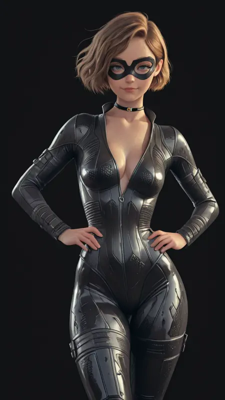 ブラックチョーカー、ゴールドトリムのチョーカー、チョーカーに付いたシルバーの星、ブラックヒーローアウトフィット、ボディスーツ、質感のあるラバー製ボディスーツ、ボディスーツの縫い目、長袖、フィットした袖、袖のバックルストラップ、深めのネックライン、下がったジッパー、Oリングジッパー、ゴールドOリング、胸元、軽い胸のほくろ、太ももに付いたバックルストラップ