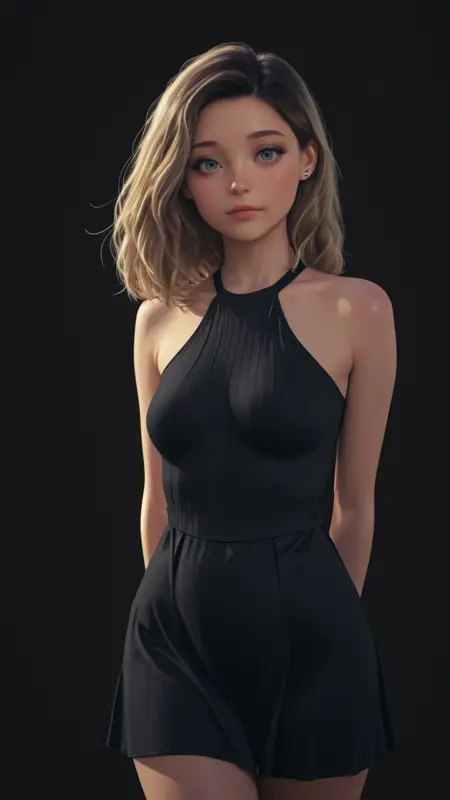 leia_shs_glam、青い目、金髪のハイライト、濃い髪の根元、中程度の髪、ウェーブスイープのヘアスタイル、唇、ツヤのある唇、メイク、アイライナー、小胸、スタッドイヤリング、ブラックドレス、高めのネックライン、ストラップレス、ノースリーブ、肩を露出、短いドレス