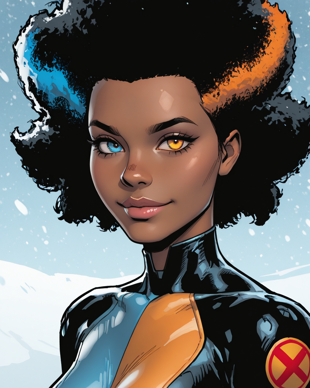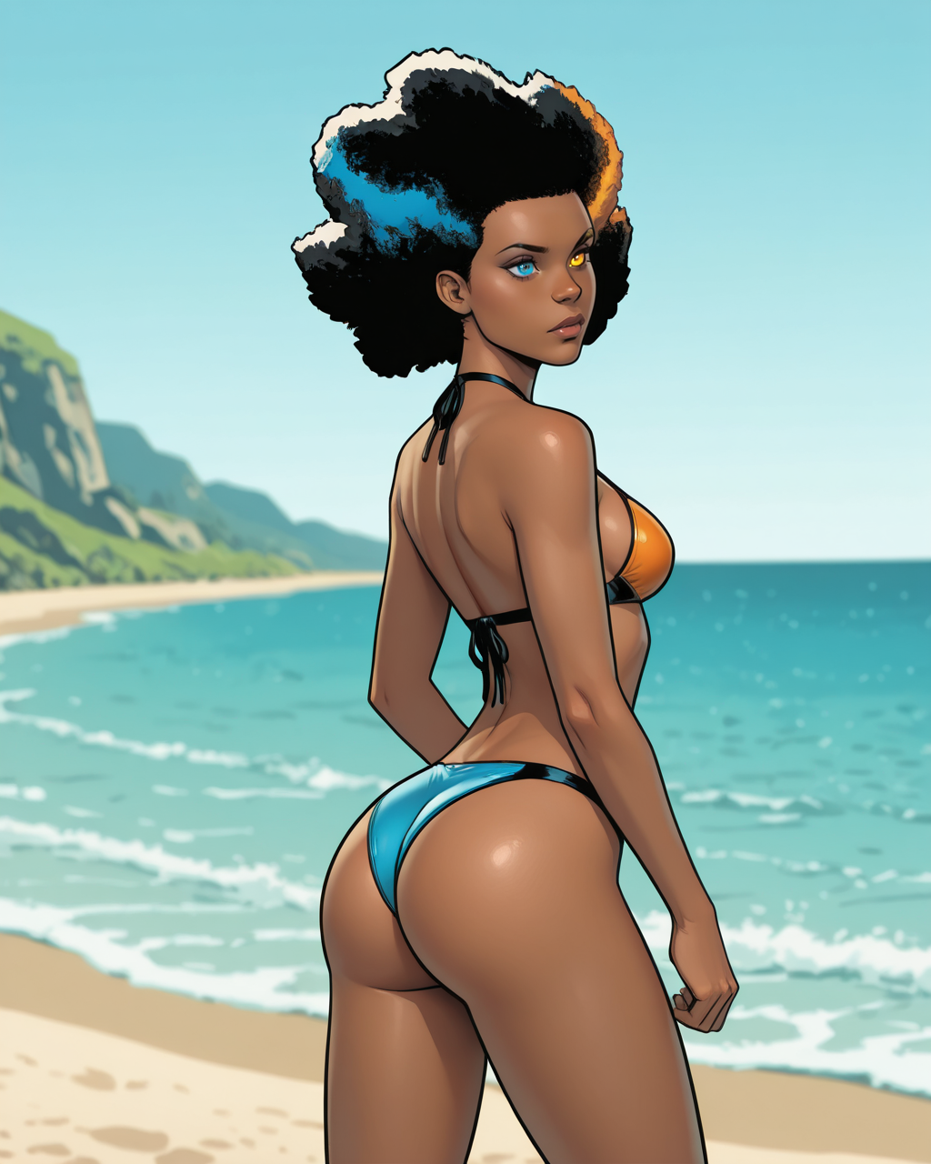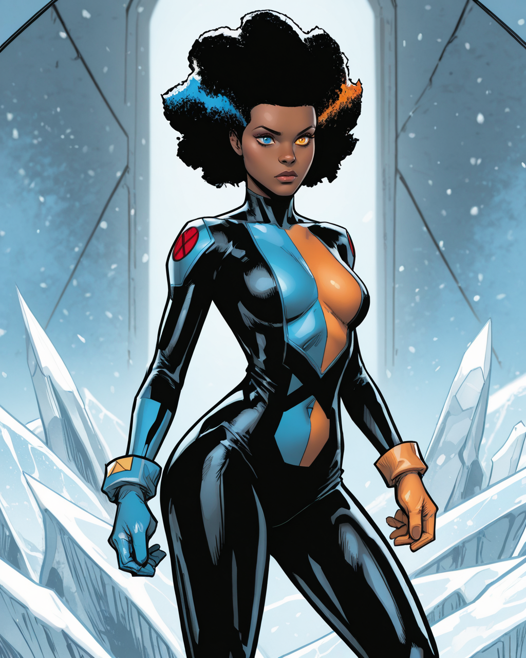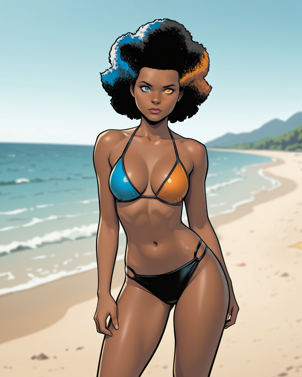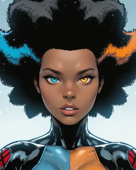 触发词:temper, 非洲发型, 多彩头发, 蓝色眼睛, 橙色眼睛, 异瞳, 深色皮肤女性, 连体衣, 手套