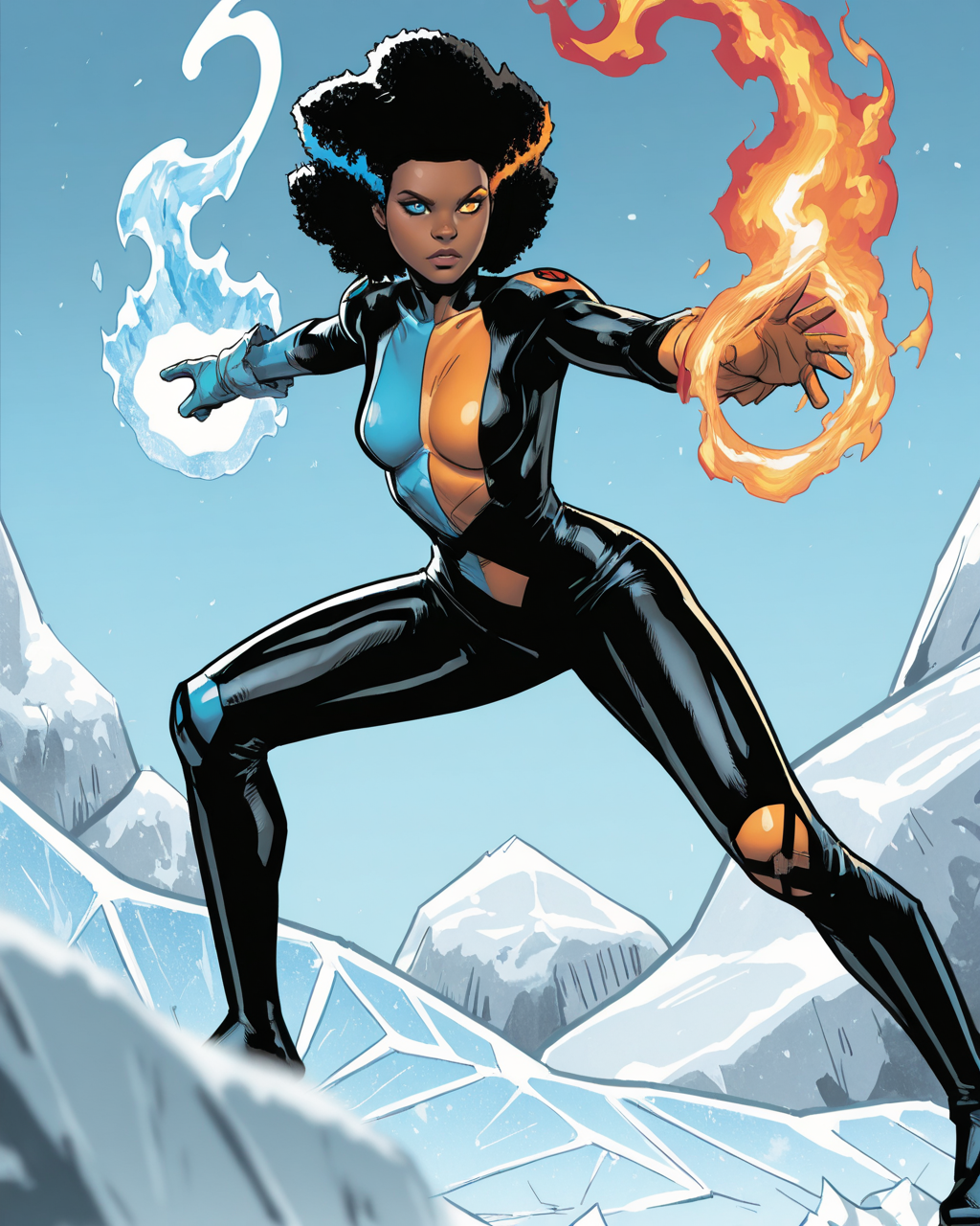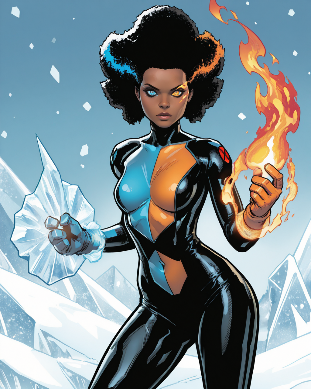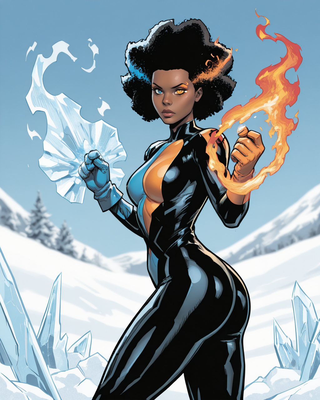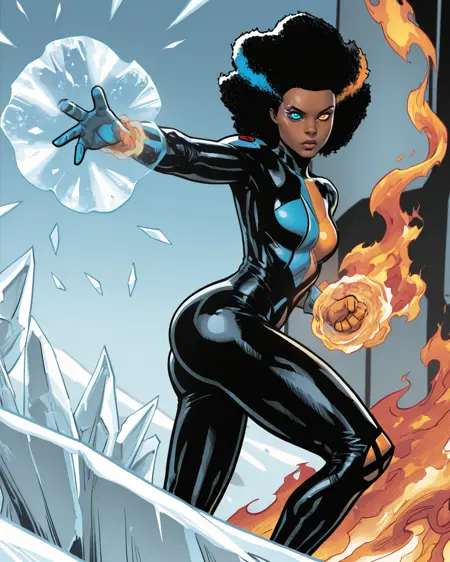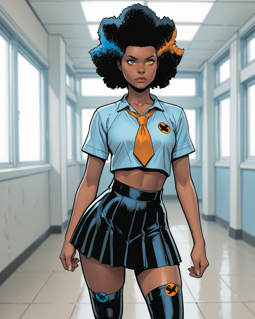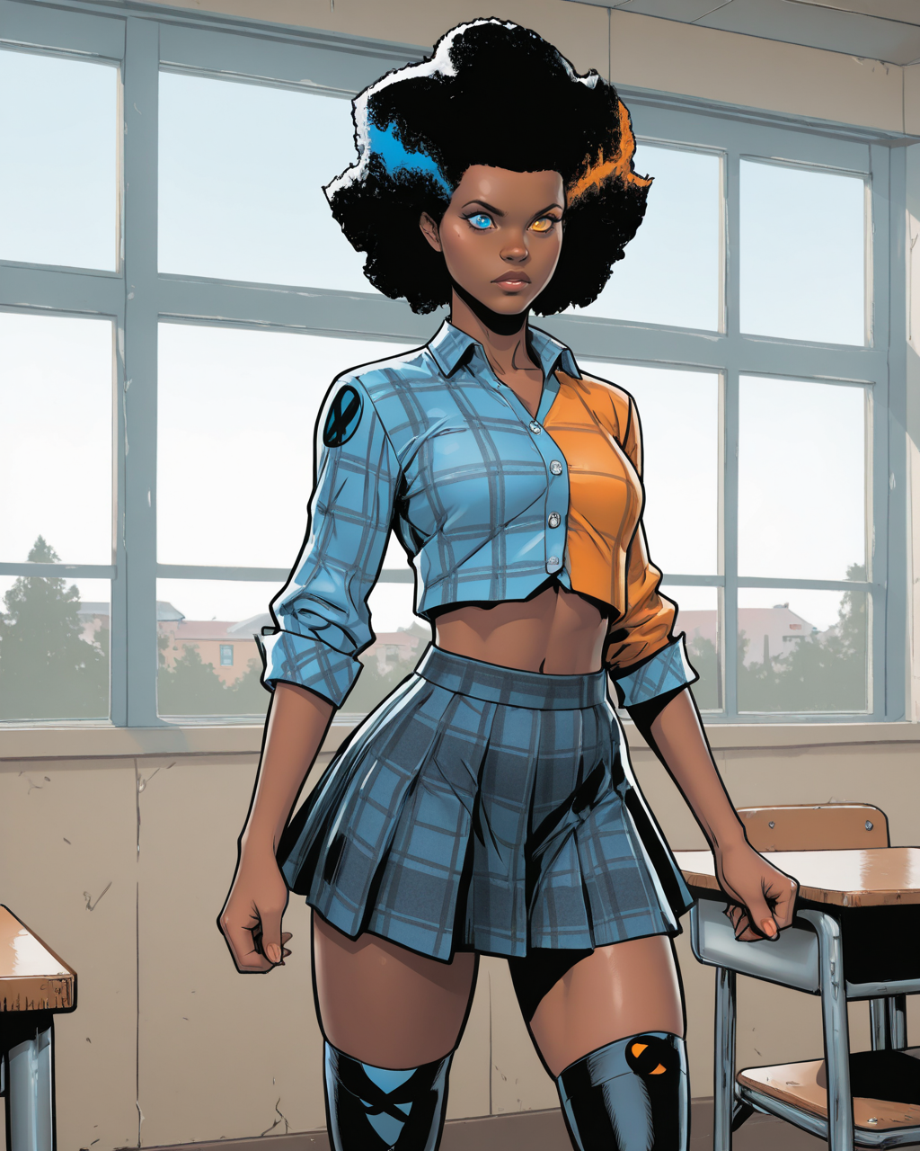 触发词:temper, 非洲发型, 多彩头发, 蓝色眼睛, 橙色眼睛, 异瞳, 深色皮肤女性, 连体衣, 手套