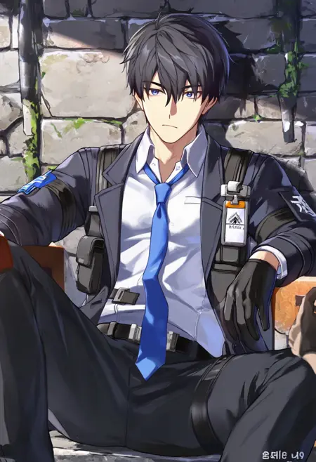 기본 복장 프롬프트 - 흰색 셔츠, 검은 장갑, 칼라 셔츠, 검은 바지, 벨트, 파란 넥타이, 검은 재킷