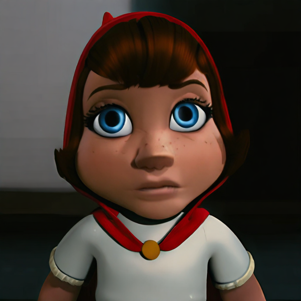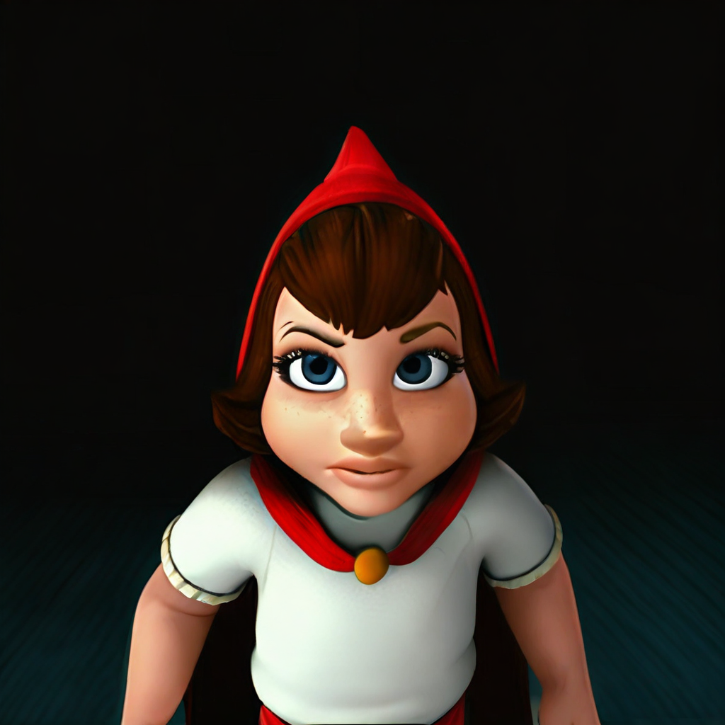 1girl, solo, redridinghood, red pointed hooded cape, big blue eyes, brown hair, freckles, mascara, concave nose bridge, upturned nose, white short sleeve shirt, blue skirt, blue pants, 4K, 3D,