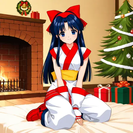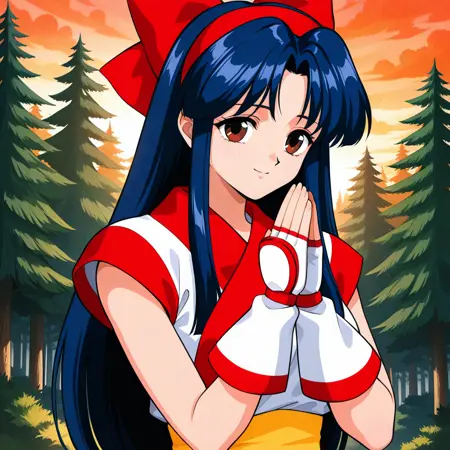 プロンプト:NKRRSSV、長い髪、髪の束、濃い青の髪、分け目のある前髪、赤いヘアバンド、赤いリボン、アイヌの服、袖なしの服、指なし手袋、ズボン、赤い靴、黄色い帯