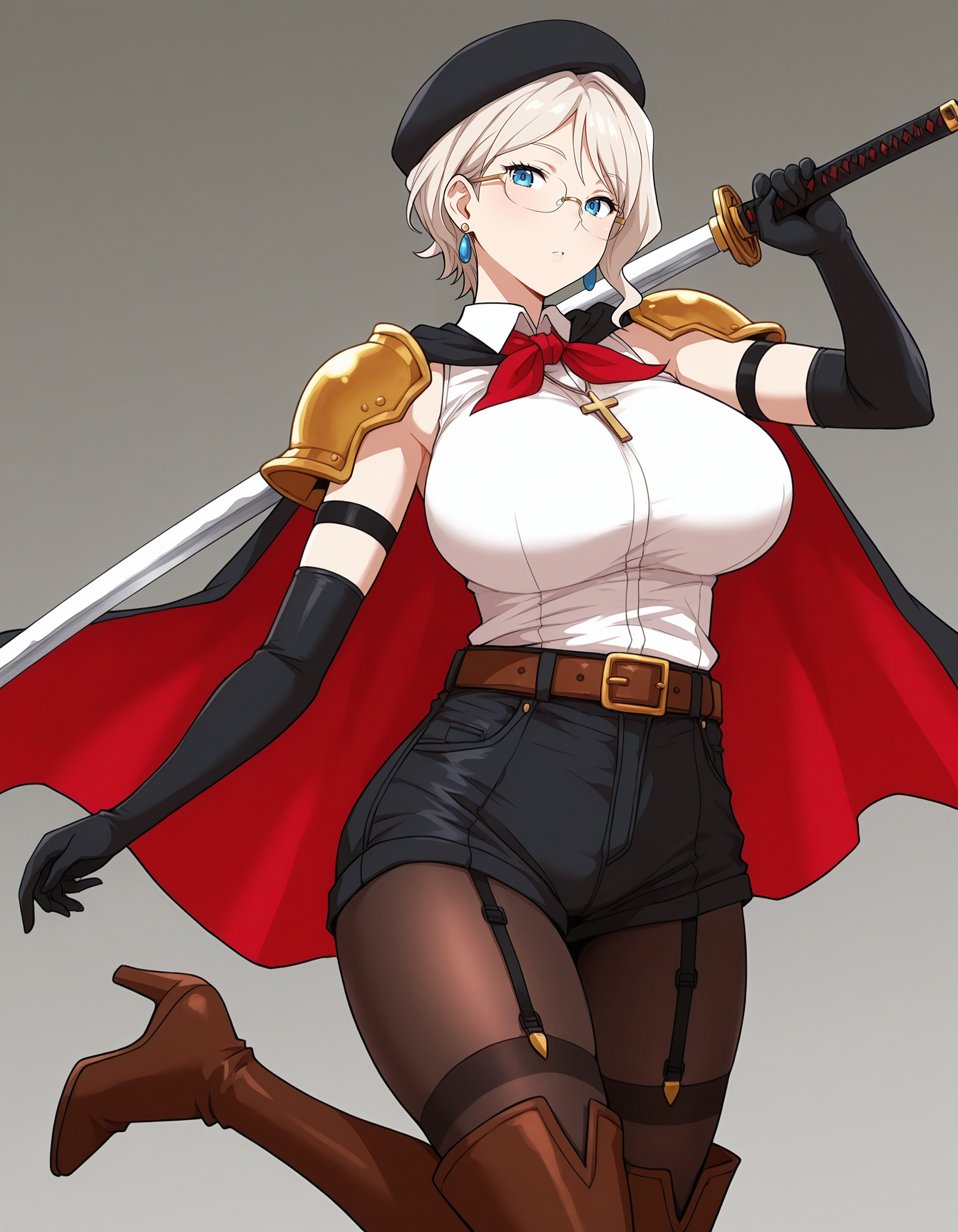 mai_bhwth,mai_yui,mature_female,long_hair,brown_hair,blue_eyes,large_breasts,teacher,grey_jacket,collared_shirt,grey_pencil_skirt,black_pantyhose,pink_high_heels