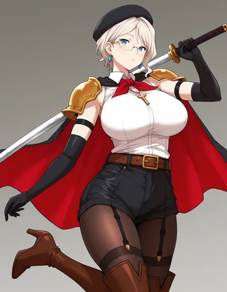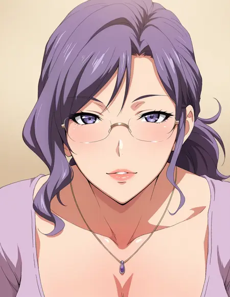 mai_bhwth,mai_naoko,mature_female,(aged_up:2), long_hair,ponytail,purple_hair,purple_eyes,large_breasts,red_lips,glasses,necklace,red_jacket,frilled_shirt_collar,teacher,white_pencil_skirt,black_pantyhose,red_high_heels