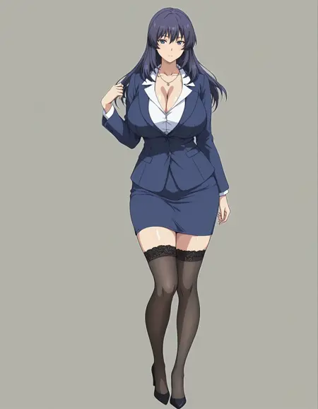 mai_bhwth,mai_kyouko,mature_female,long_hair,purple_hair,purple_eyes,large_breasts,necklace,blue_business_suit,collared shirt,black_thighhighs,lace-trimmed legwear,high_heels