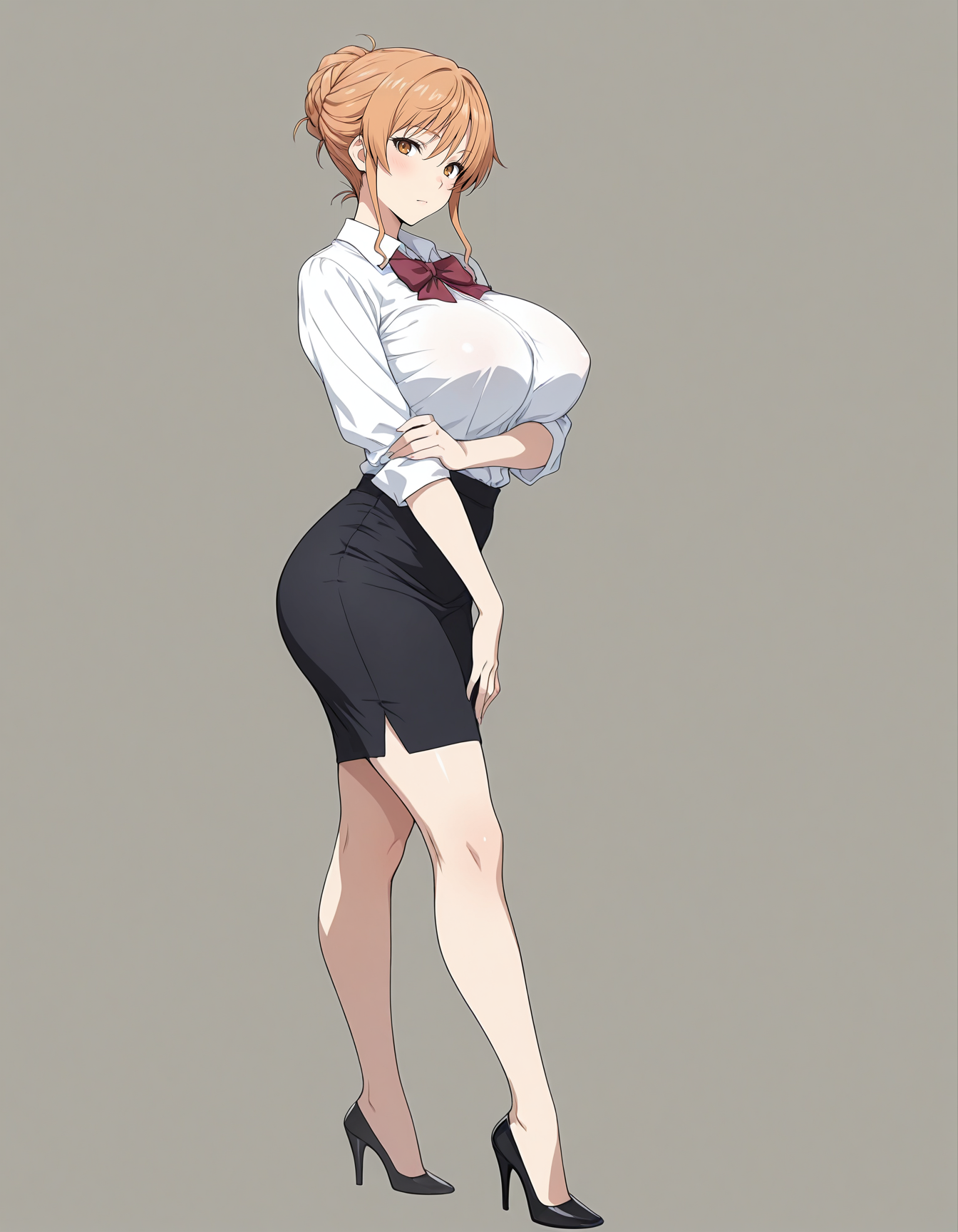 mai_bhwth,mai_miwa,mature_female,blonde_hair,brown_eyes,large_breasts,shirt,bow,single_hair_bun,pencil_skirt,high_heels