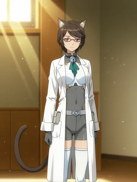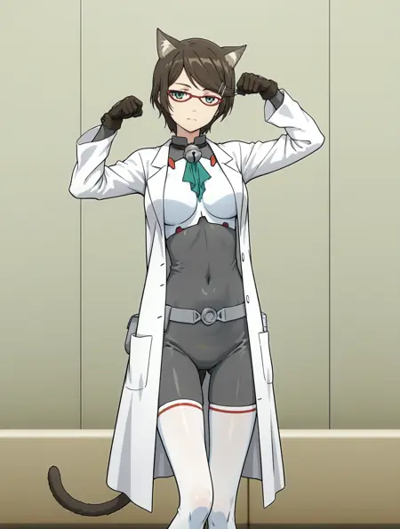 グレーのボディスーツ、白い胸ラボコート、ベルトポーチ、手袋、白い太ももハイズ、太ももブーツ