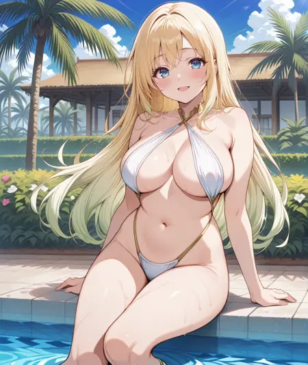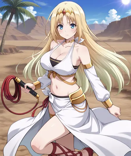 태그: FeliciaBase, 파란 눈, 긴 머리, 그라디언트 머리, 금발, 금 관모, 어깨 노출, 큰 가슴, 가슴 사이, 앞목 뼈, 투톤 크롭 탑, 흰색 크롭 탑, 검은색 크롭 탑, 할터 네크, 목에 리본, 금색 목걸이, 허리, 배꼽, 분리형 소매, 금색 테두리, 허리 리본, 흰 치마, 측면 슬릿, 붉은 채찍, 금색 허벅지 끈, 발목 끈 신발, 붉은 신발,