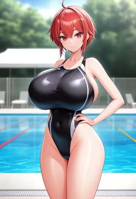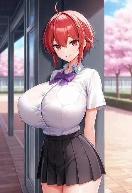 red eyes, red hair, short hair, ahoge, hairclip