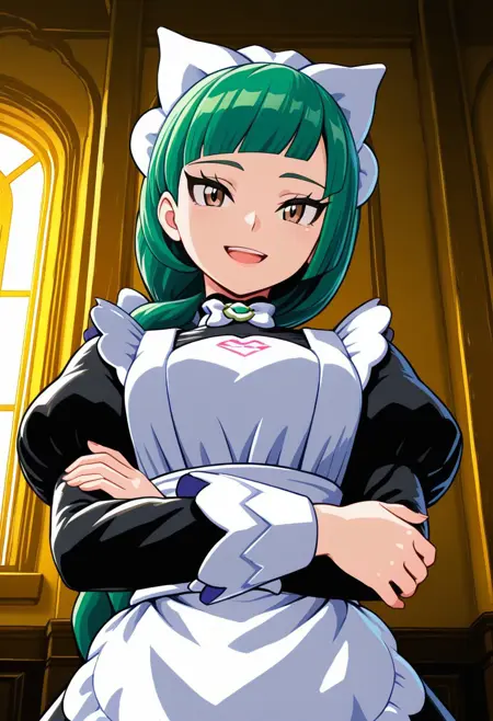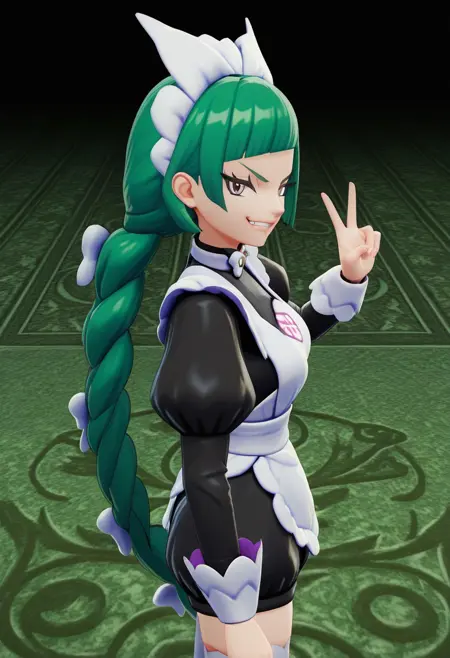 Lebanne,白い肌,緑の髪,非常に長い髪,一本編み,前髪,まつげ,ヘーゼル色の目,メイド,メイドの帽子,エプロン,長袖,ふくらはぎの袖,太ももまでの靴下,靴