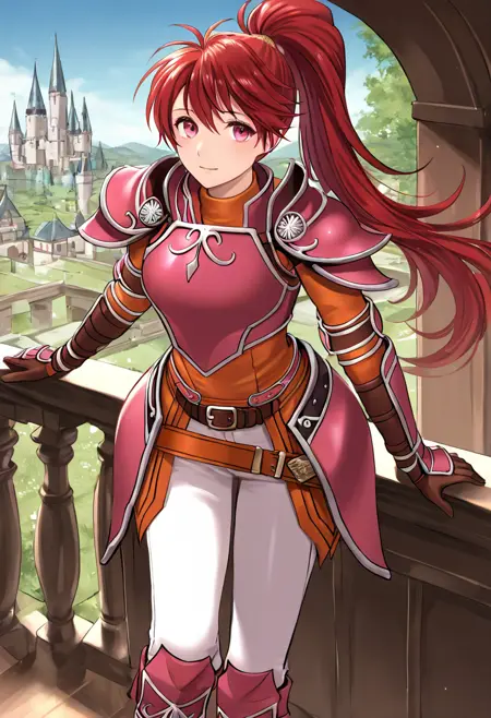 트리거 단어: JillFE, 긴 머리, 높은 포니테일, 붉은 머리, 분홍색 눈, 갑옷, 분홍색 갑옷, 은색 테두리, 주황색 터틀넥, 어깨 갑옷, 장갑, 벨트, 흰색 바지, 분홍색 부츠,