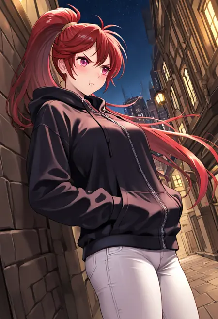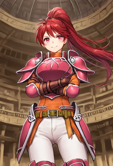 触发词:JillFE,长发,高马尾,红发,粉眼,盔甲,粉色盔甲,银色镶边,橙色高领,肩甲,护手,腰带,白裤,粉靴