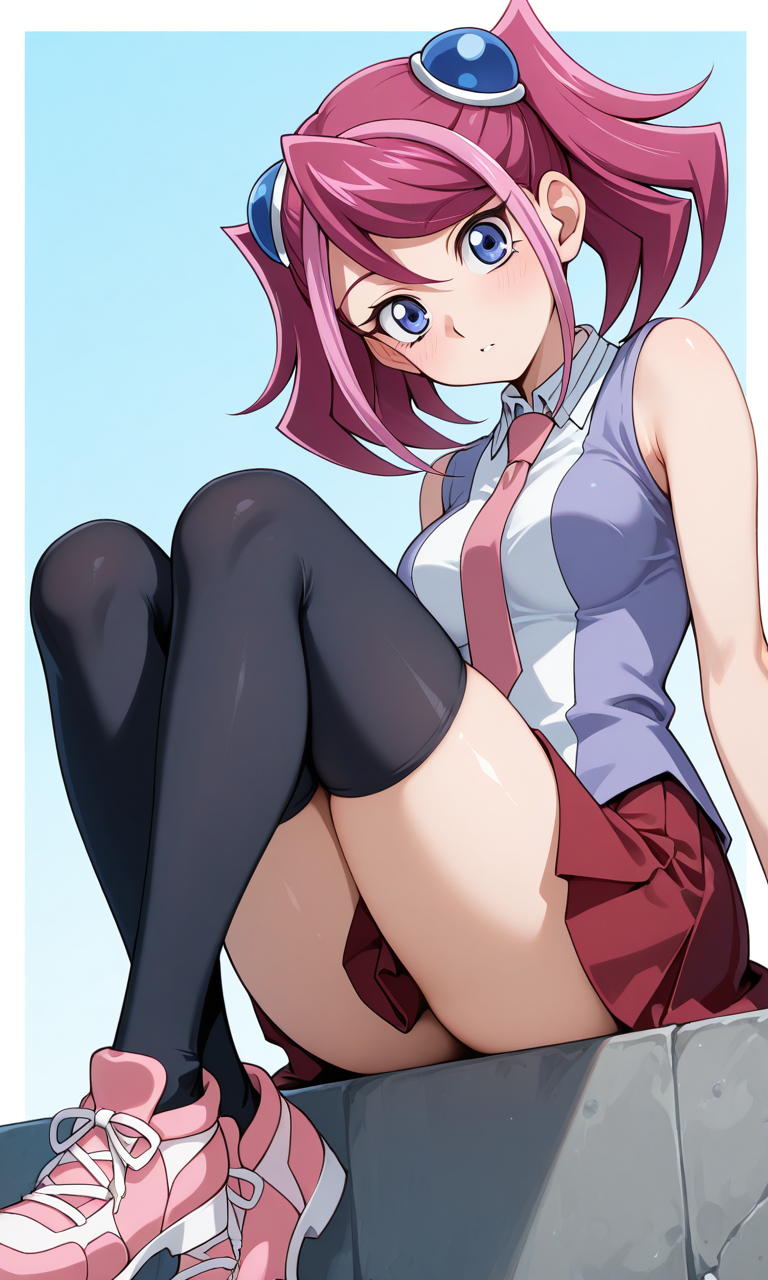 히이라기 유즈(YU-GI-OH! ARC-V), 파란 눈, 머리 장식, 파란 머리핀, 중간 길이 머리, 다채로운 머리, 분홍색 머리, 줄무늬 머리, 트윈테일, 중간 사이즈 가슴, 허벅지, 분홍색 넥타이, 소매 없는 셔츠, 다채로운 셔츠, 팔찌, 주름진 스커트, 빨간 스커트, 검은 허벅지 양말