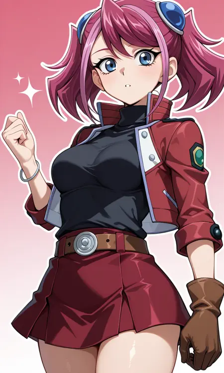 히이라기 유즈(YU-GI-OH! ARC-V), 파란 눈, 머리 장식, 파란 머리핀, 중간 길이 머리, 다채로운 머리, 분홍색 머리, 줄무늬 머리, 더블 테일, 중간 크기 가슴, 허벅지, 셔츠, 검은 셔츠, 터틀넥, 재킷, 빨간 재킷, 열린 재킷, 장갑, 갈색 장갑, 한 손 장갑, 보석, 팔찌, 벨트, 스커트, 빨간 스커트