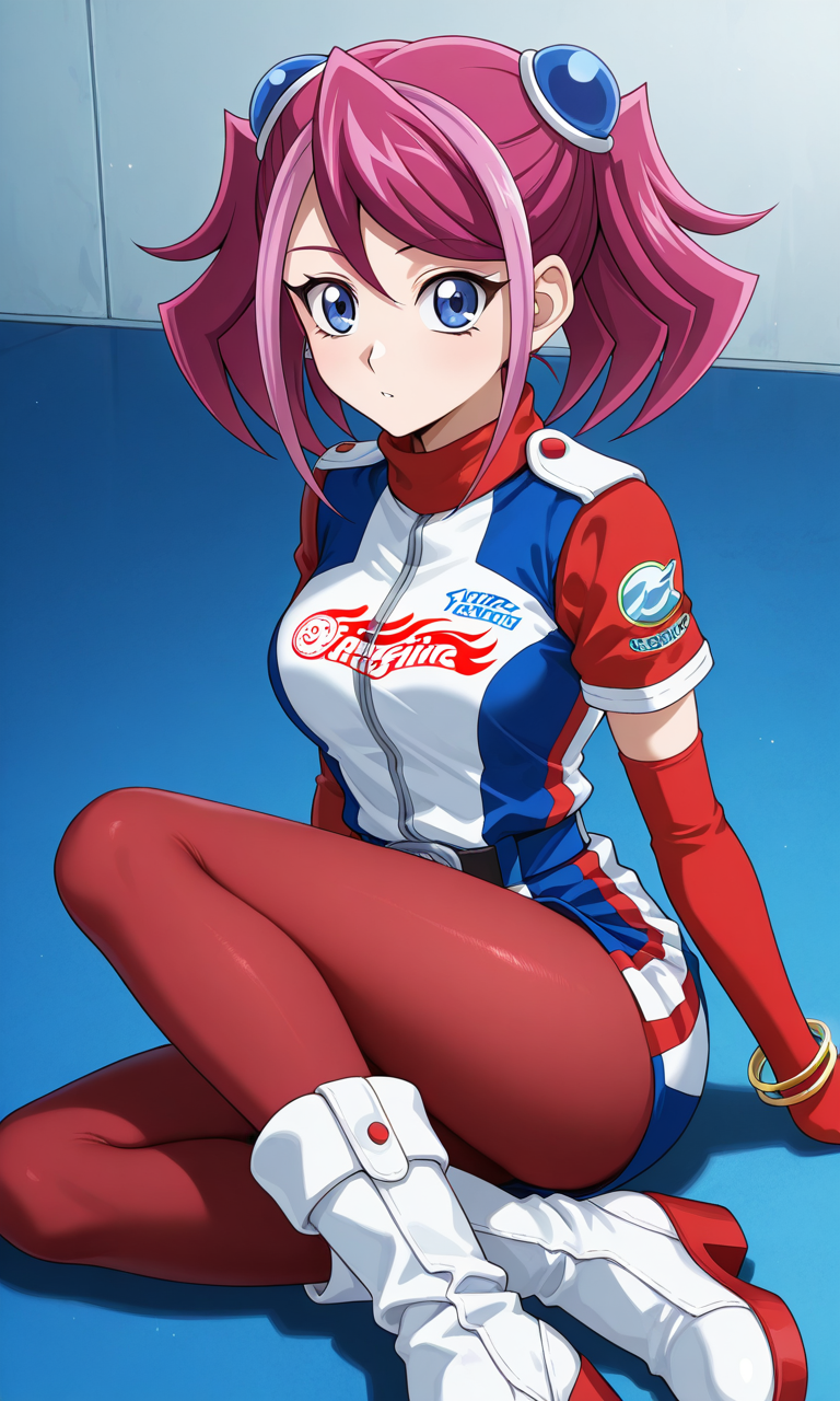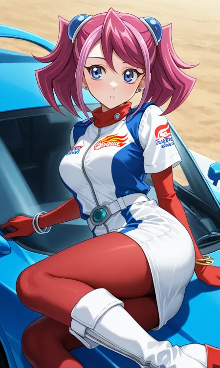 히이라기 유즈(YU-GI-OH! ARC-V), 파란 눈, 머리 장식, 파란 머리핀, 중간 길이 머리, 다채로운 머리, 분홍색 머리, 줄무늬 머리, 더블 테일, 중간 크기 가슴, 허벅지, 레이싱 수트, 짧은 소매, 팔꿈치 장갑, 보석, 팔찌, 빨간 스타킹, 부츠, 흰색 신발