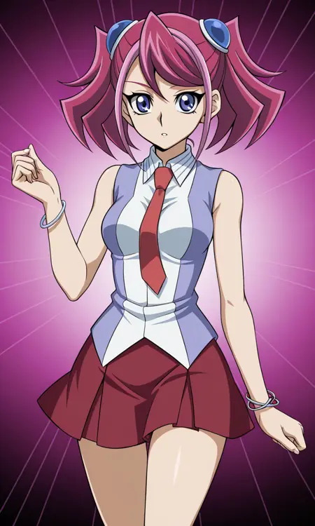 히이라기 유즈(YU-GI-OH! ARC-V), 파란 눈, 머리 장식, 파란 머리핀, 중간 길이 머리, 다채로운 머리, 분홍색 머리, 줄무늬 머리, 트윈테일, 중간 사이즈 가슴, 허벅지, 투톤 셔츠, 보라색과 흰색 셔츠, 날개형 칼라, 소매 없는 셔츠, 팔이 드러남, 오른손 팔찌, 단일 팔찌, 보석, 빨간 넥타이, 주름진 스커트, 빨간 스커트, 검은 허벅지 양말, 분홍색 신발