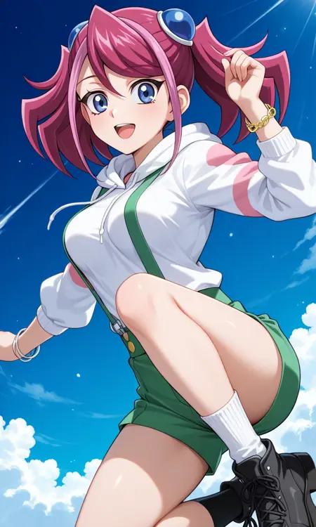 히이라기 유즈(YU-GI-OH! ARC-V), 파란 눈, 머리 장식, 파란 머리핀, 중간 길이 머리, 다채로운 머리, 분홍색 머리, 줄무늬 머리, 트윈테일, 중간 사이즈 가슴, 허벅지, 핫 핑크색 소매가 있는 흰색 후디, 오른쪽 하단에 큰 노란 별, 후디 밑에 단색 흰색 티셔츠, 녹색 반바지에 스트랩, 왼쪽에 검은색 기터, 팔찌와 어긋난 양말(하나는 노란색이고 접힌 것, 하나는 길고 흰색), 검은 발목 부츠