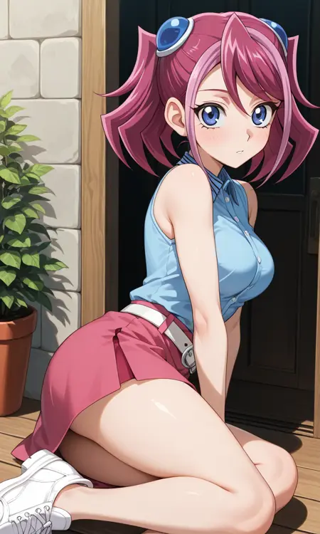 히이라기 유즈(YU-GI-OH! ARC-V), 파란 눈, 머리 장식, 파란 머리 클립, 중간 길이 머리, 다색 머리, 분홍색 머리, 줄무늬 머리, 트윈테일, 중간 크기 가슴, 허벅지, 캐주얼, 벨트, 분홍색 치마, 소매 없는, 흰 신발