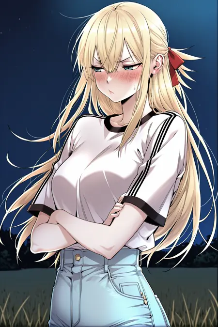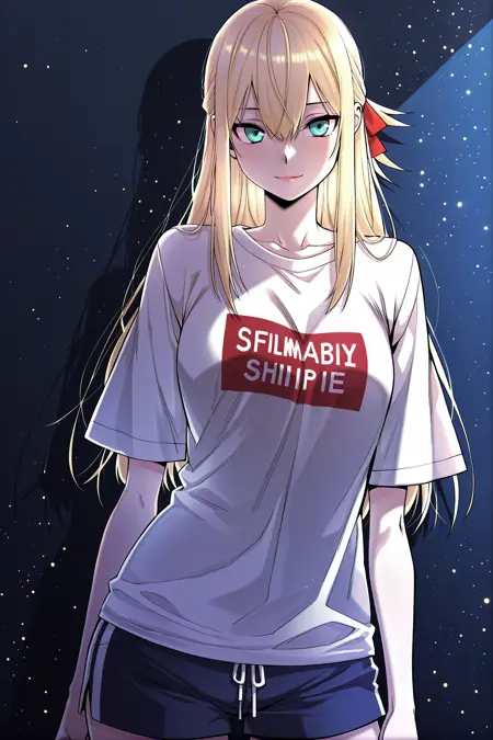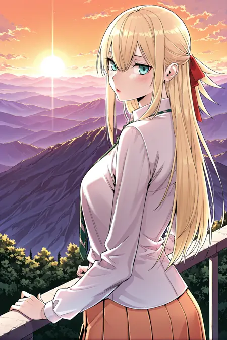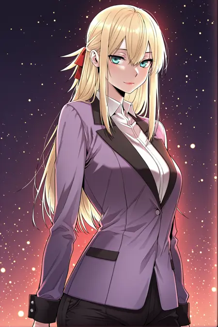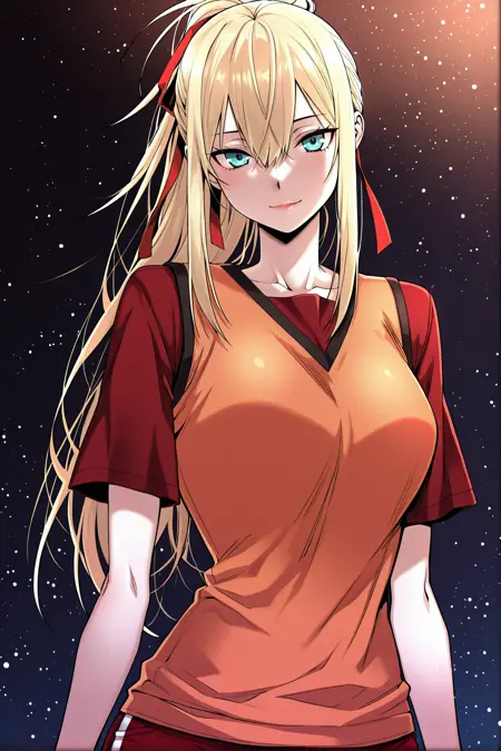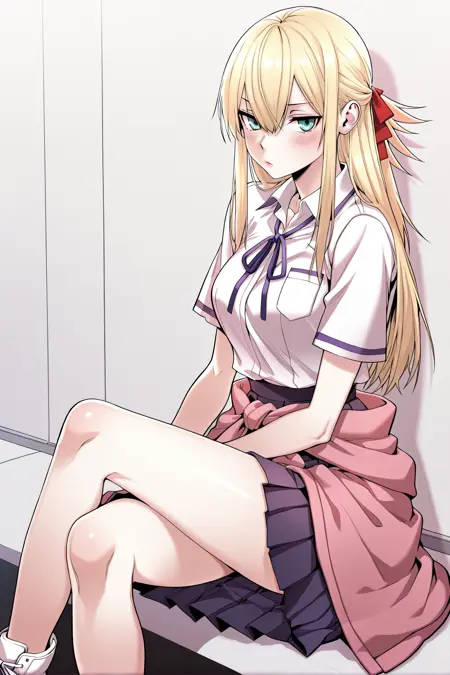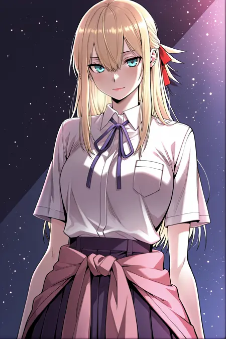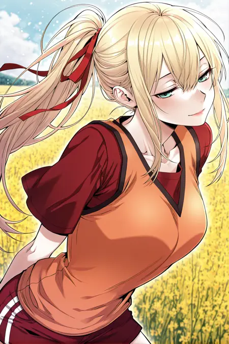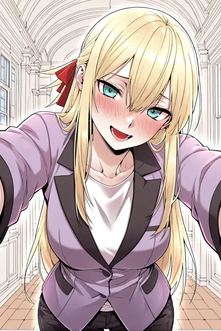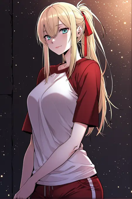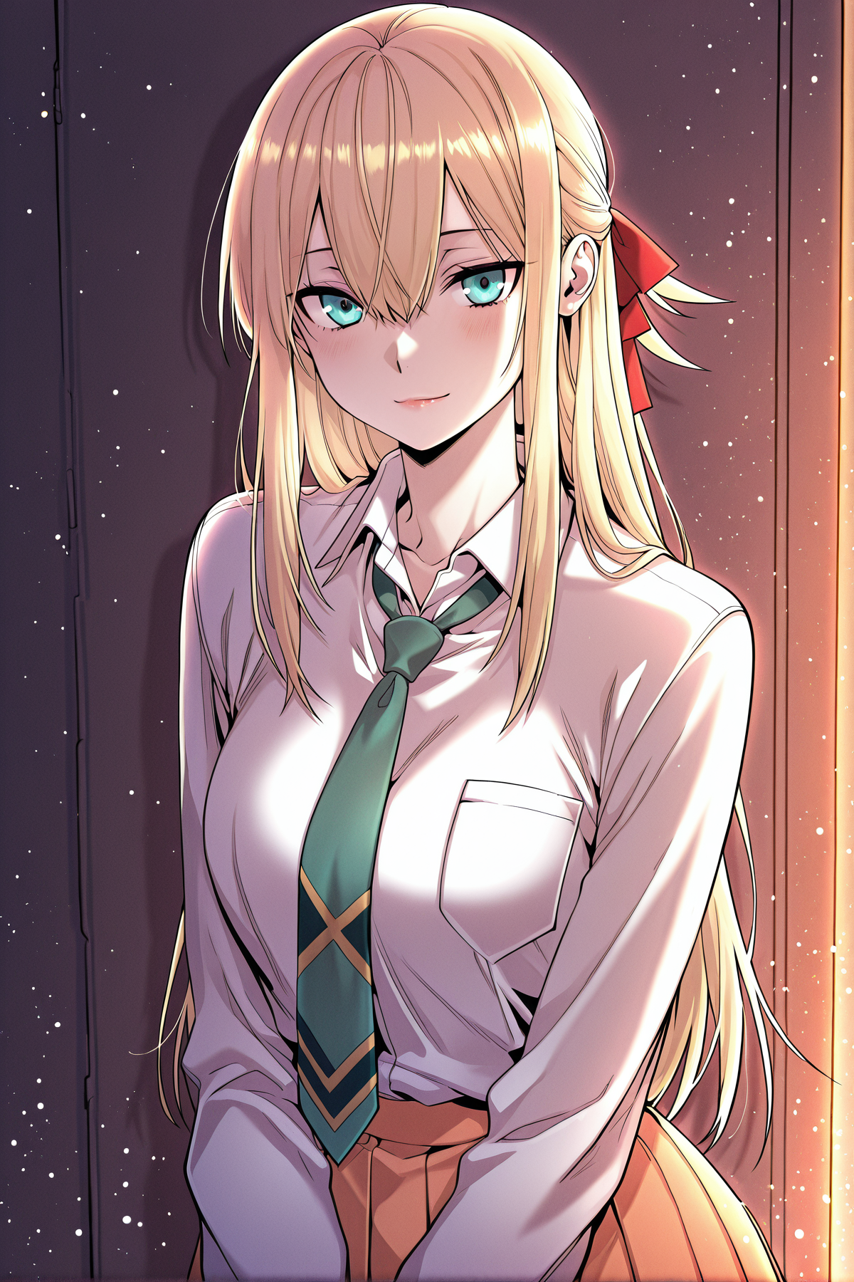 Yoodahee, 1girl, solo, turquoise eyes, blonde hair, long hair, uneven bangs, hair between eyes, ponytail, long sidelocks, hair ribbon, red hair ribbon,