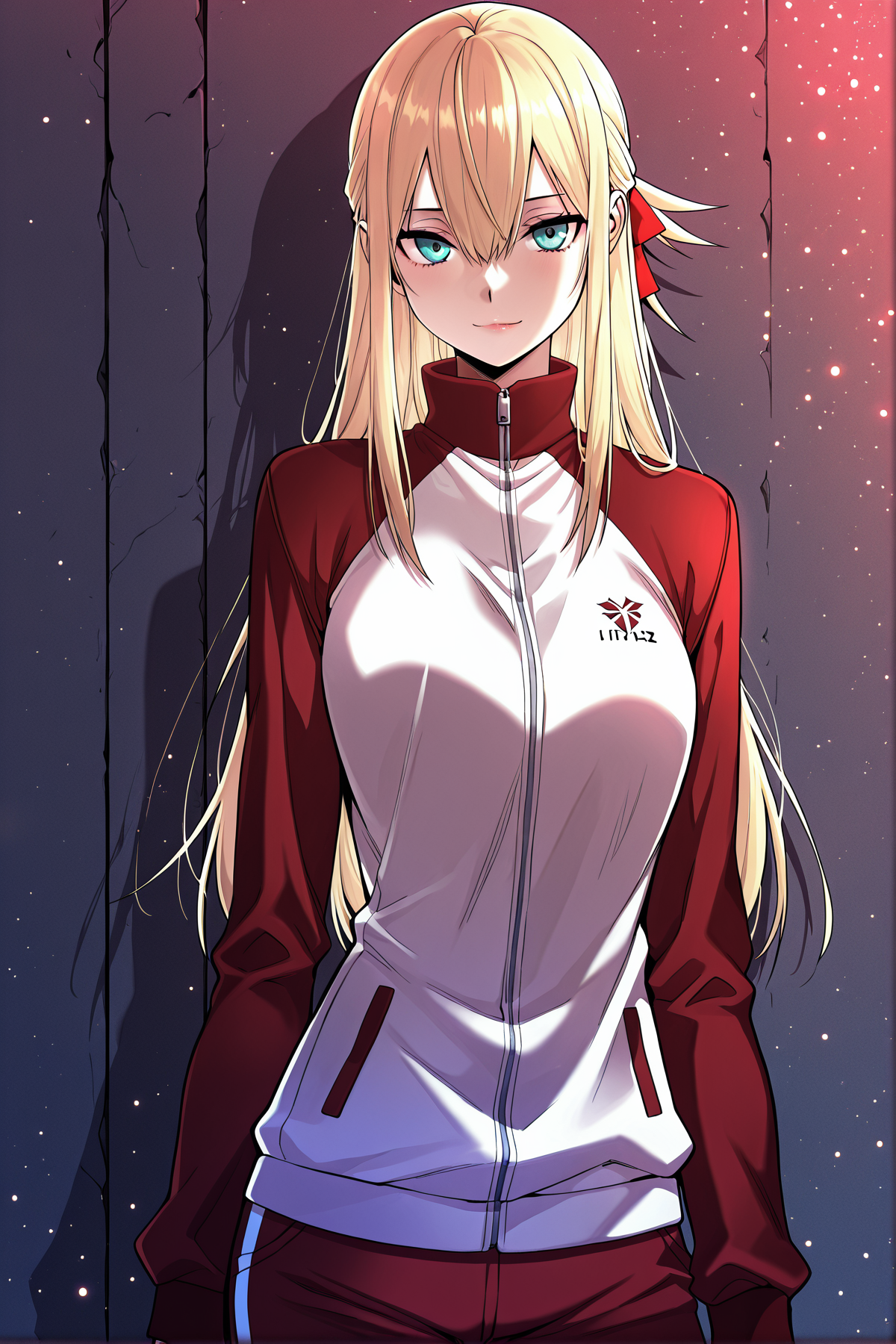 Yoodahee_outfit8, red and white tracksuit jacket, white front tracksuit jacket, zipper jacket, long sleeves, red sleeves, stand collar, red collar, red track pants, white side stripes pants, sneakers,