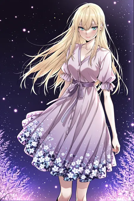 Yoodahee_outfit6, lavender dress, short sleeves, puff sleeves, tied cuffs, v neck dress, button front, waist ribbon, lavander ribbon, purple sash, tied sash, floral gradient skirt, floral pattern, purple shoes, ankle strap shoes