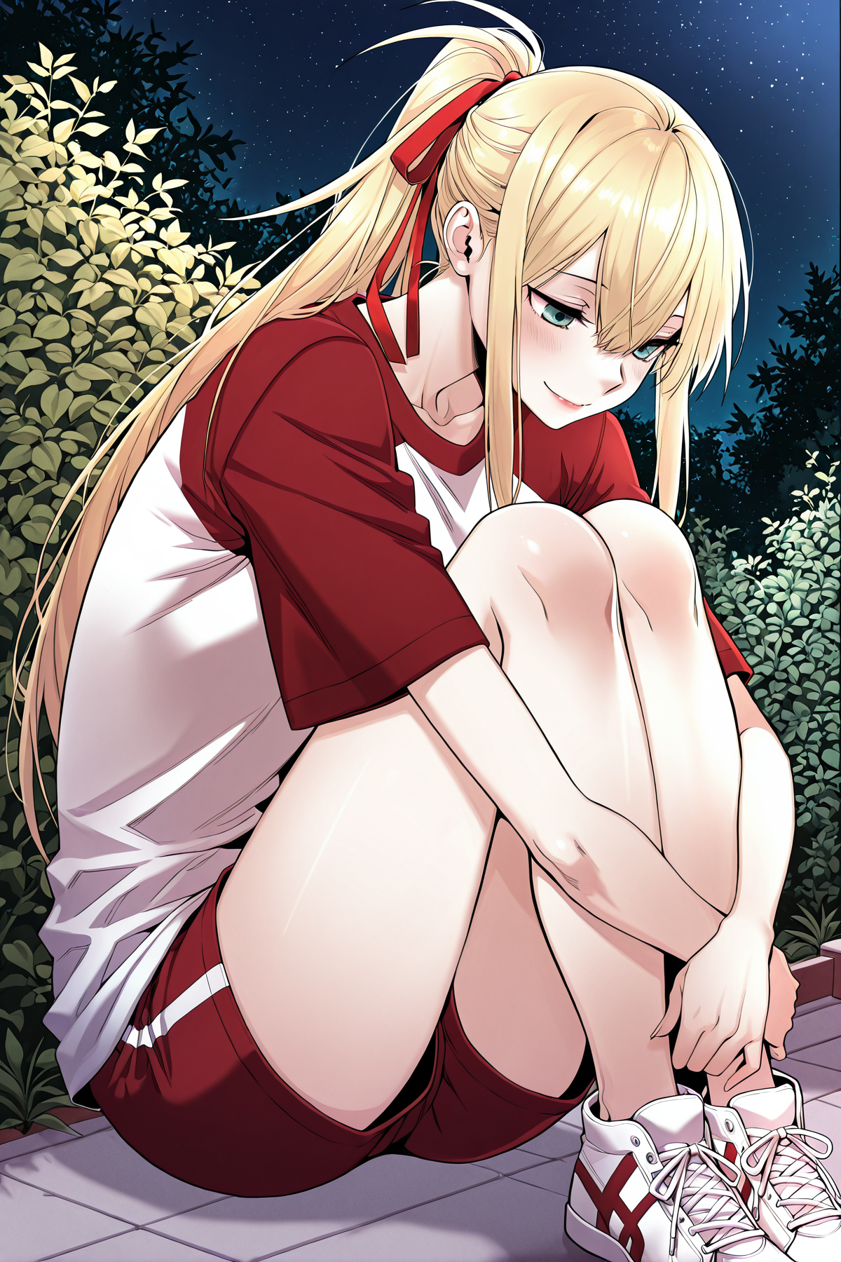 Yoodahee_outfit9, white shirt, red sleeves, short sleeves, crew neck, red neck, red shorts, white side stripes shorts, white sneakers