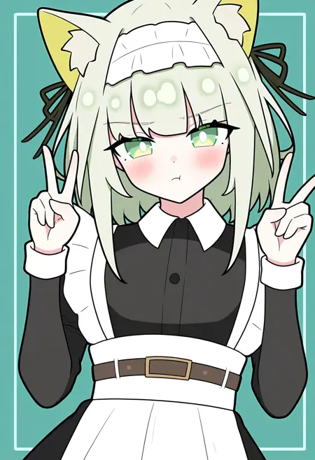 トリガーワード:kal'tsit maid,1girl,solo,kal'tsit \(arknights\),animal ears,maid,cat ears,green hair,green eyes,animal ear fluff,maid headdress,official alternate costume,dress,white apron,black dress,long sleeves,juliet sleeves,maid apron,puffy sleeves,hair ribbon,medium hair,black ribbon,frills,belt,long dress,
