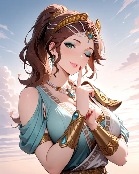 jewelry, dress, bracer, single pauldron, shoulder cutout, earrings, tiara, gem, red nails, pearl necklace, side slit
