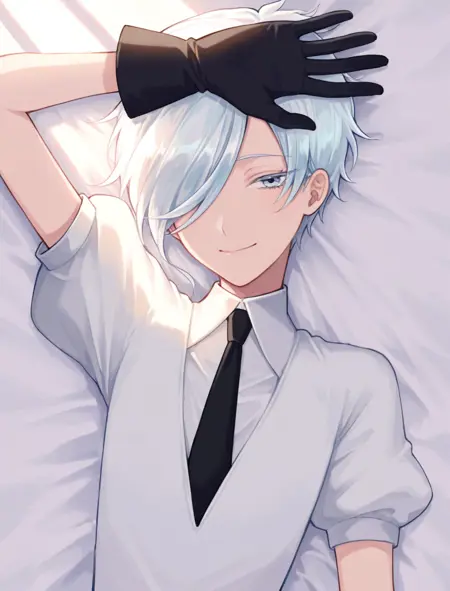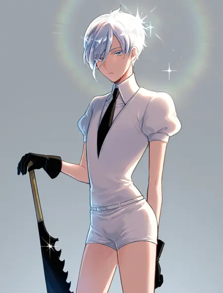 white shirt, white jacket, black necktie, belt, black gloves, black shoes, white shorts