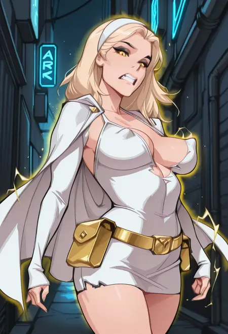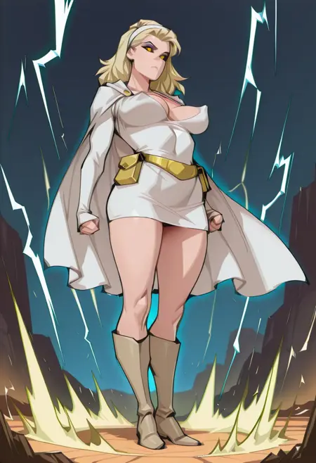 halterneck, white dress, miniskirt, cleavage, sleeves past wrists, white cape, golden belt, golden pouch, perky breasts, covered nipples