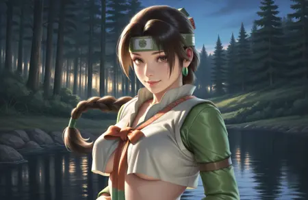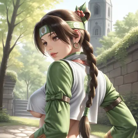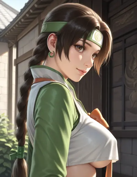 開始プロンプト:1girl, seong mi-na, brown hair, headband, braid, long hair, single braid, earrings, hair ornament, brown eyes, crop top, white vest, green sleeves, underboob, sideboob, navel, midriff, long green skirt, bare leg
