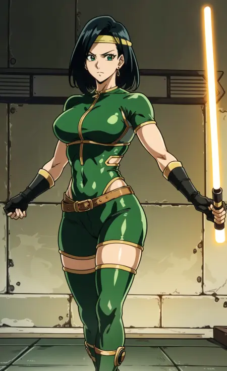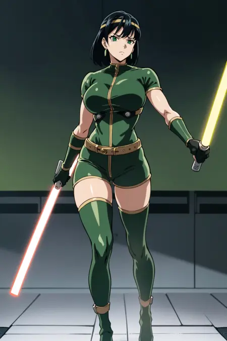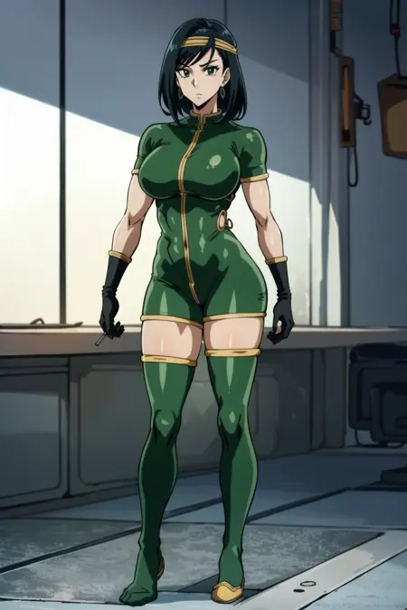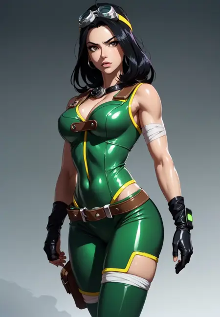 B Orchid, 1girl, solo, black hair, thighhighs, boots, leotard, gloves, weapon, short hair, high heels, green leotard, green footwear, breasts, fingerless gloves, dual wielding, shorts, ass, gloves, fingerless gloves, goggles, goggles on head, belt