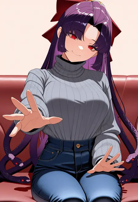 Sh1k0ku, red eyes, purple hair, long hair, curtained hair, snake hair, hair bow, red bow