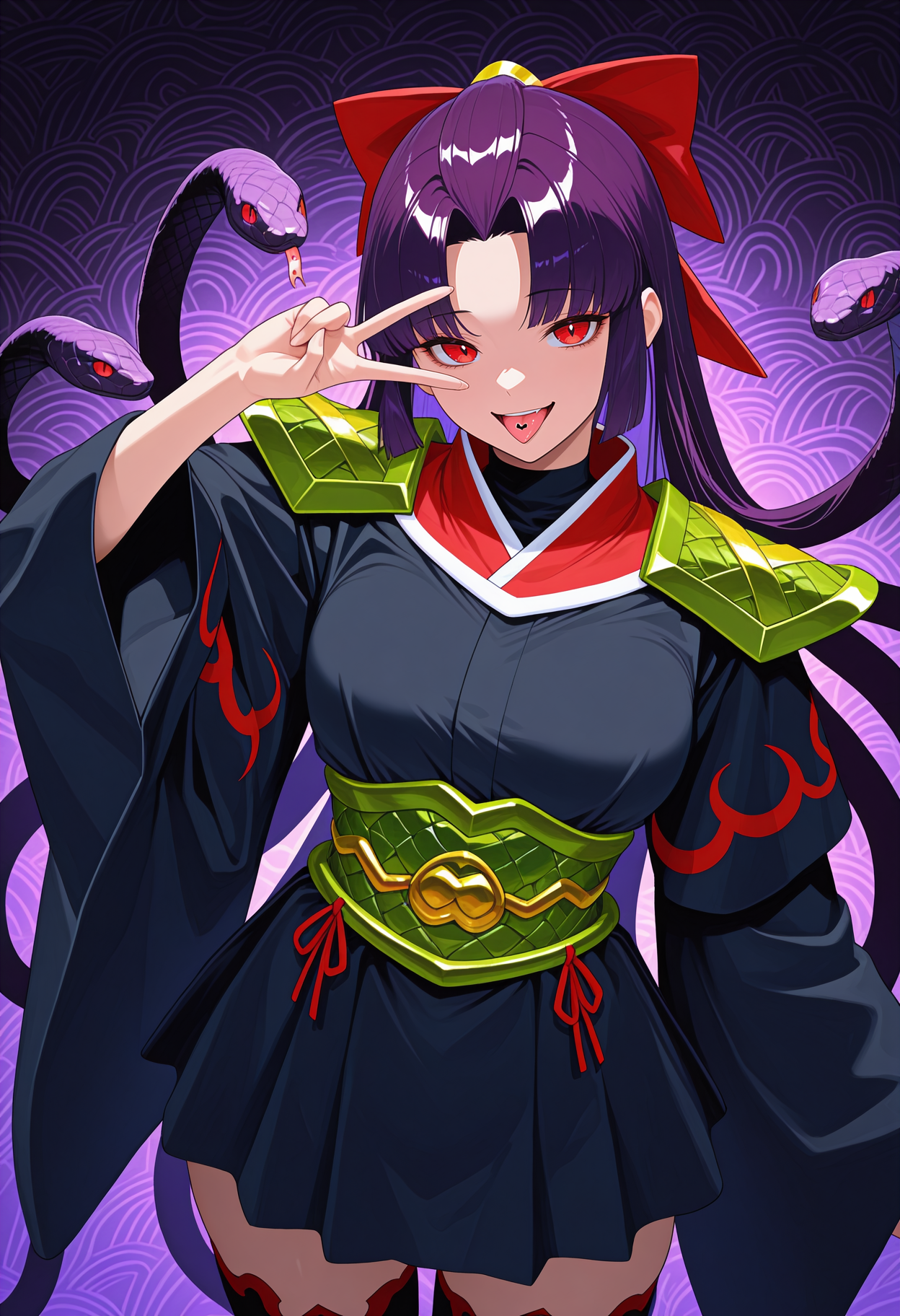 Sh1k0ku, red eyes, purple hair, long hair, curtained hair, snake hair, hair bow, red bow, black kimono, short kimono, long sleeves, wide sleeves, green shoulder armor, green waist armor, black thighhighs