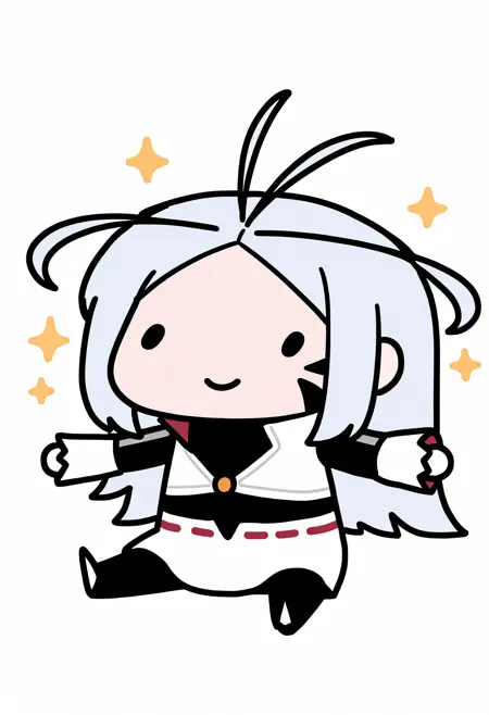 A0baW4kura, orange eyes, silver hair, ahoge, antenna hair, long hair, facial mark, high collar, popped collar, white jacket, cropped jacket, detached sleeves, underboob, black bodysuit, white gloves, white skirt, medium skirt