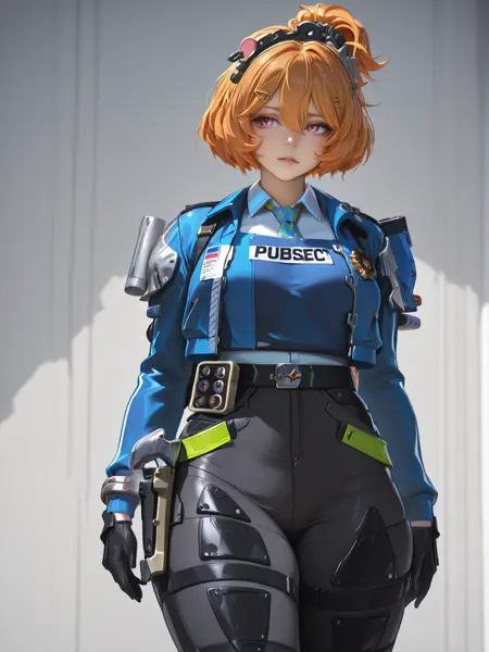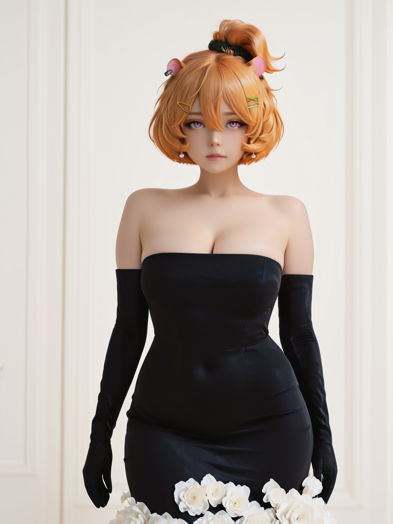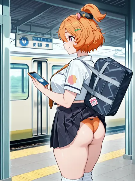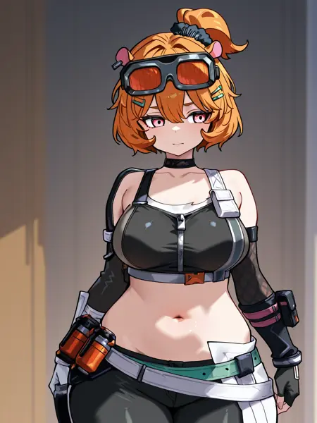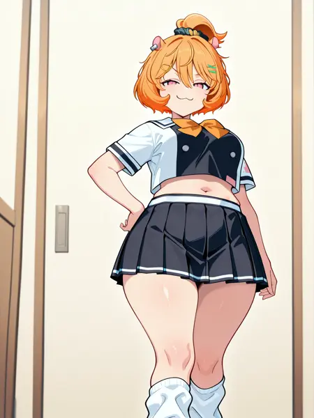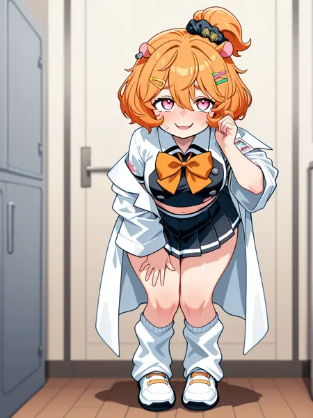 | 训练词汇 | Eisami, orange hair, hair between eyes, short hair, pink eyes, animal ears, hamster ears, hairclip, hair scrunchie, topknot, medium breasts, orange bow, short sleeves, two-tone crop top, patch, id card, midriff, low skirt, black pleated skirt, leg warmers, white shoes, off shoulder, lab coat,已复制! |