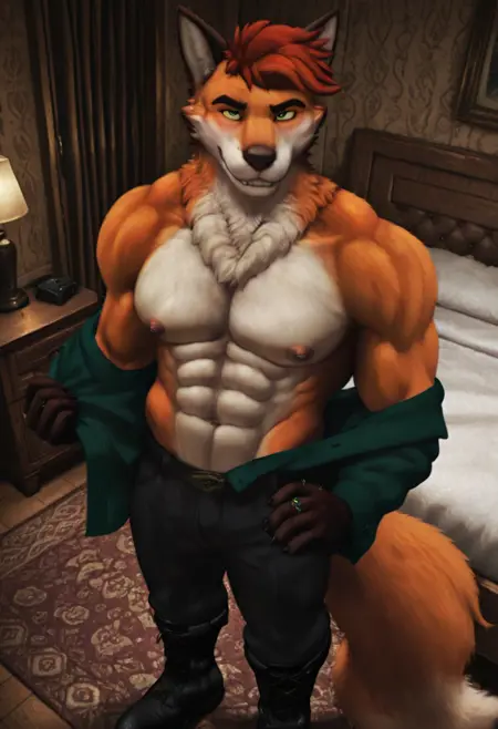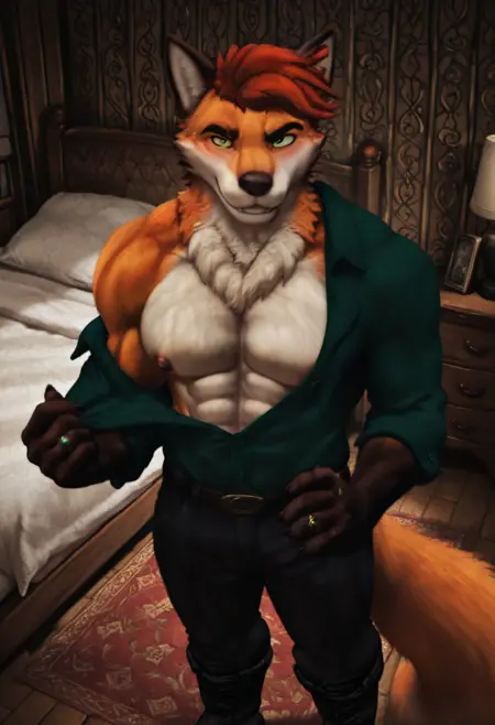 强化提示: "furry, male, fox tail, green eyes, red hair"