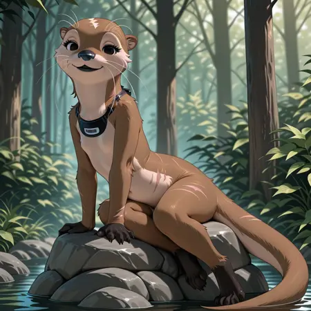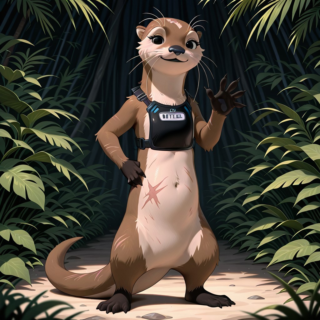 otter, otter girl, brown and tan fur, black eyes, black nose, whiskers, black paws, webbed paws, otter tail, scars, black lips,